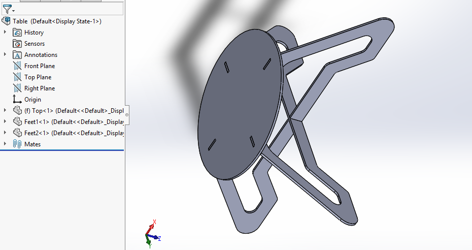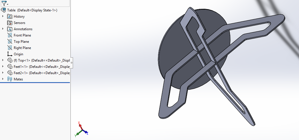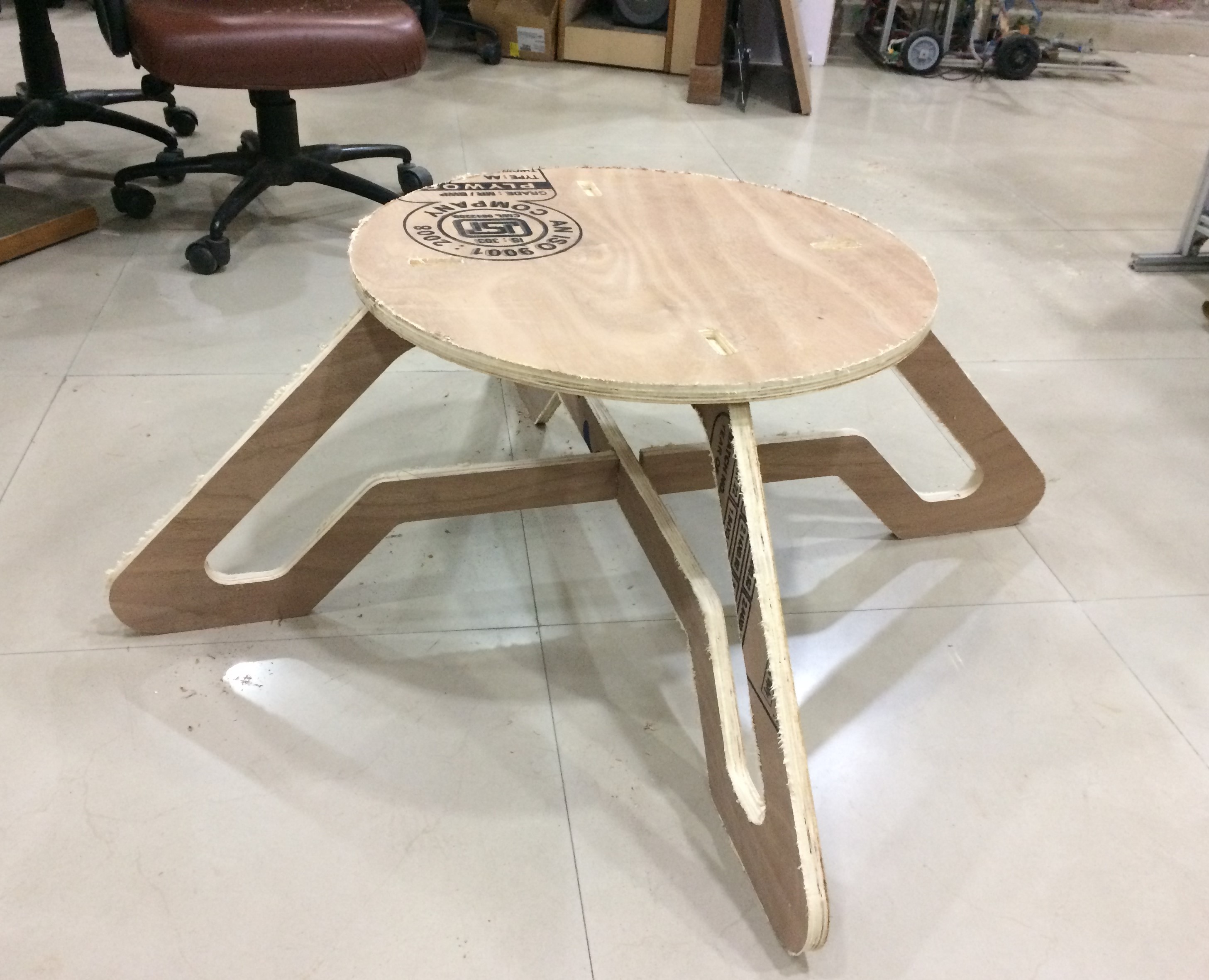 Design is created using SolidWorks with approximately 2 feets dia. and 1 feet height. Three part files are made i.e. Two feets of the table and a top, keeping the thickness of the plywood in mind (17 mm). All these three parts are assembled to make sure proper assembly of the parts. Part files and assembly of the table can be downloaded below.