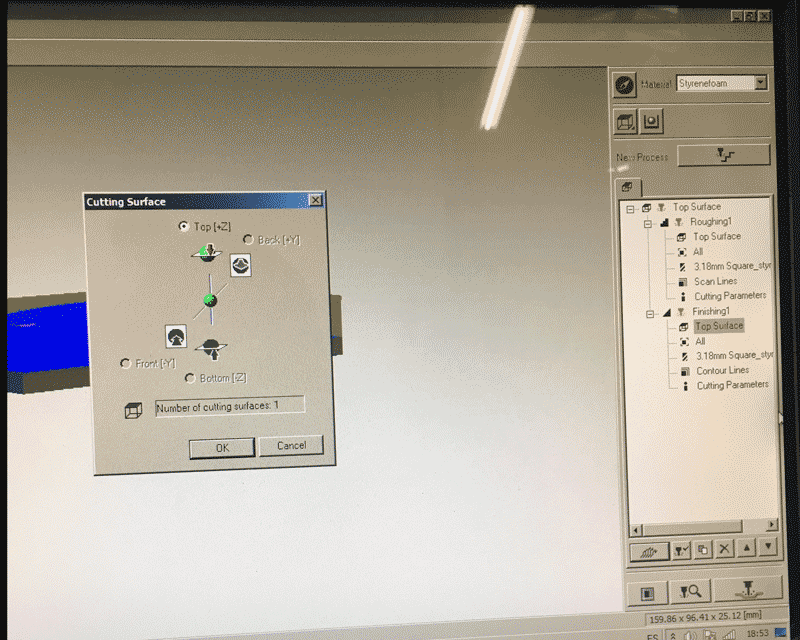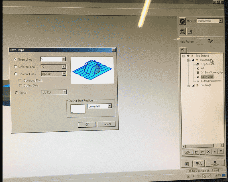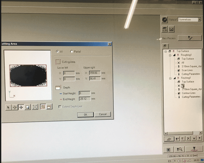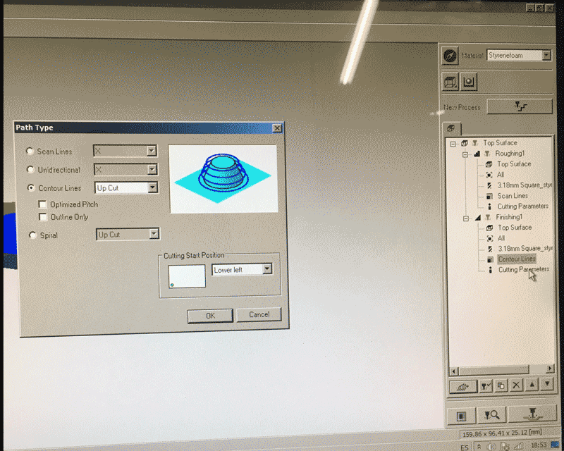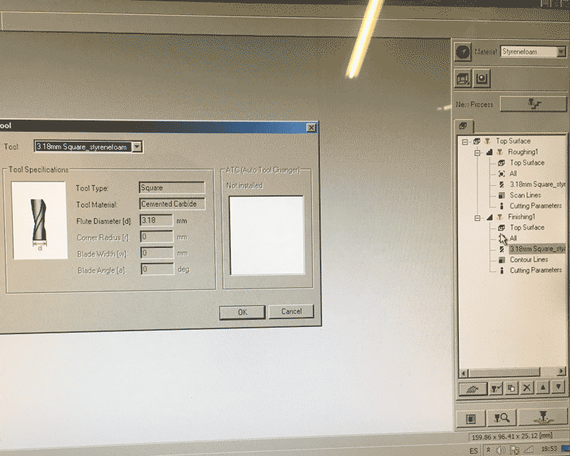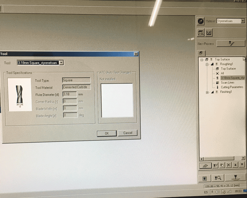 Before pressing the button next to the 'New process' for creating two milling process, I have to choose the material first and this time I used 'Styrenefoam'. The first one is roughing and the second one is finishing.