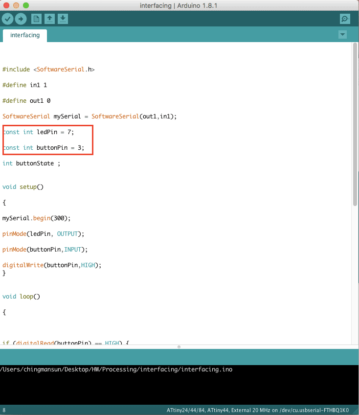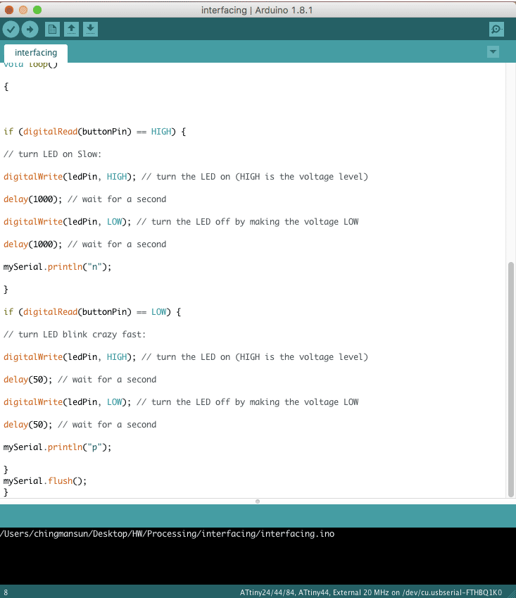 For this week assignment, I used backed the board of LED and button which i have made in electronic design week. Then, I programmed the board with Arduino and followed by processing application.