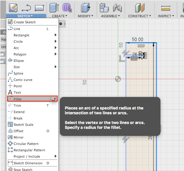 For making a 'Fillet', choose from 'Sketch'.