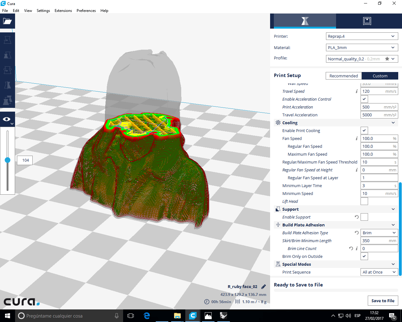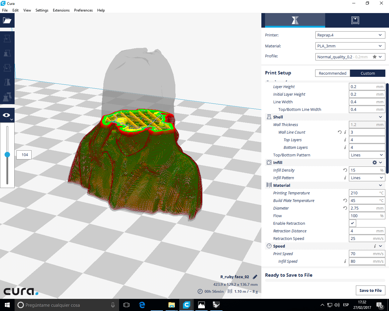 I used machine Reprap 4 for the printing and Cura for the software. The material used is PLA 3mm. The settings are shown in the picture as follows. The good point of using Cura is that when you adjust any settings on the right hand-side, the effect will be automatically shown with the figure, then I will know the approximate outcome of the changes and to see whether this is what I want when I 3d print the object.