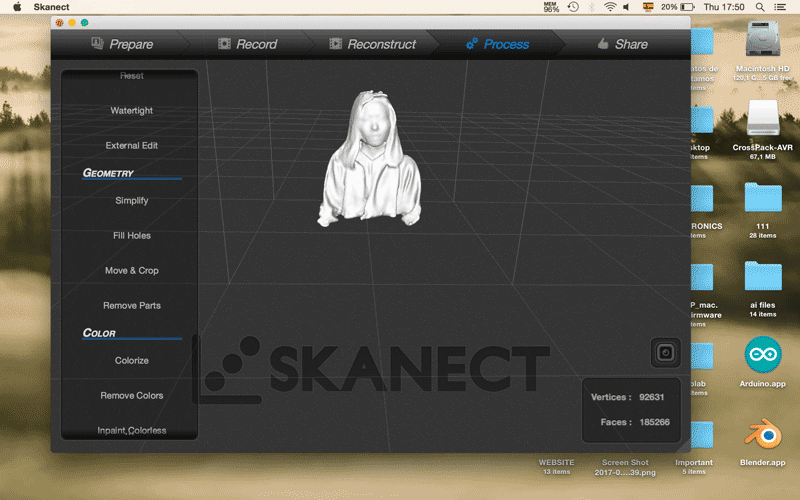 Skanect is used for scanning with the connection of Xbox. (I just downloaded the free version of Skanect for the trial.) For the preparation, I keep all the settings as original but choose the path to where I want the file to be located. Making sure that sensor is connected with the software as the sign of 'Structure Sensor' will turn from orange to green. After connection, i start the recording.To have a better scanning, I tried to turn very slowly, in order to capture every part of the body.