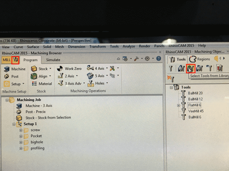 Go to the 'add tools' logo, then find the folder through 'Fab students'-'Fabacademy2007'-'Master class'-'Milling'. After finding the folders, all the tools are being added, while the most common use is 'Flatmill 6'.