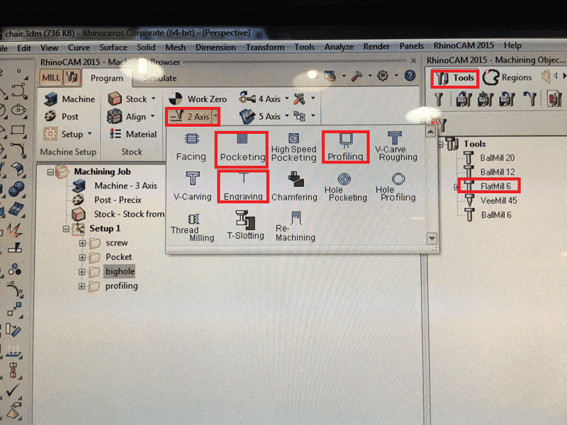 Go to ' Machine operation' and '2 axis', then 'engraving'. Press the 'select drive', then right-click on screw layer, select the object and 'enter'. For the engraving, go to 'tool', press tool "Flatmill 6' and generate/save.