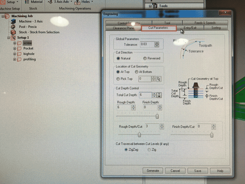 For Cutting parameters, total cut depth is 6. Rough depth is 6.