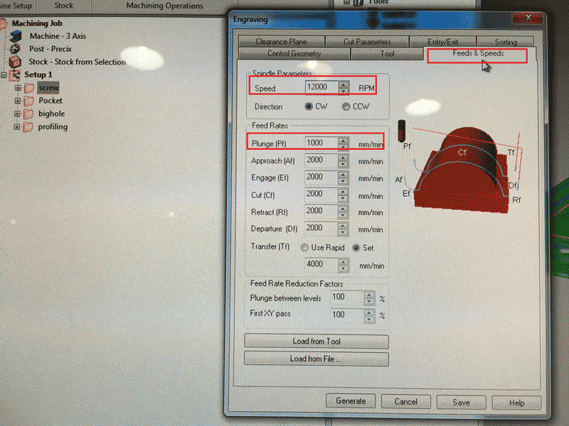 For Feeds and Speeds, change 'Plurge' to 1000 and 'Speed' is 12000.
