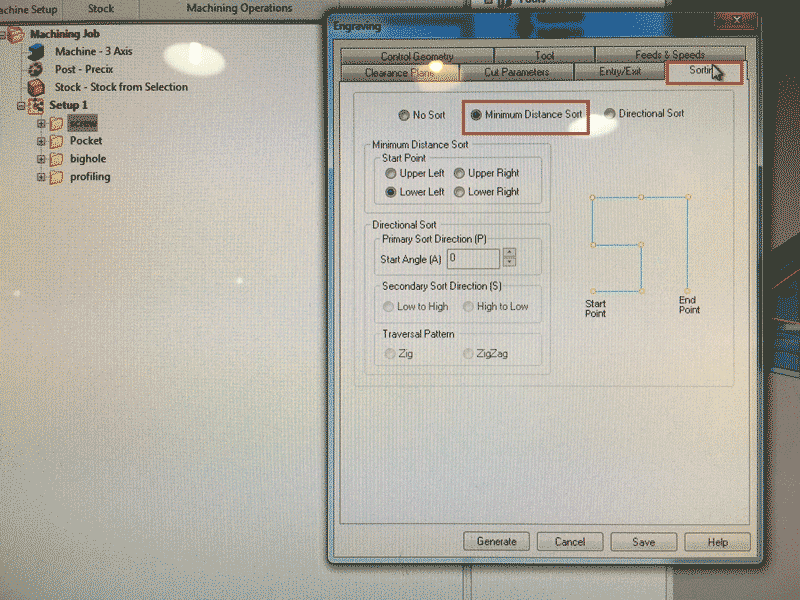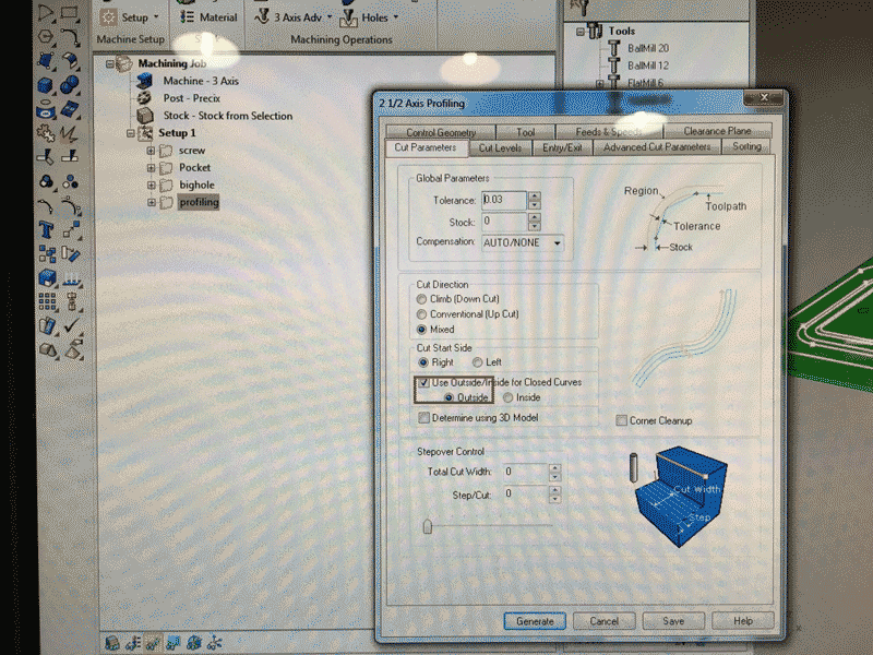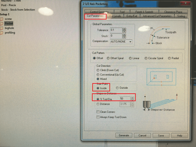 Pocketing is for breaking small pieces. In the cut parameters, % Tool Diameters is 50 and set the 'Stock' 0 for no furnishing.Set 'Inside'for start point For the other settings, they are the same.