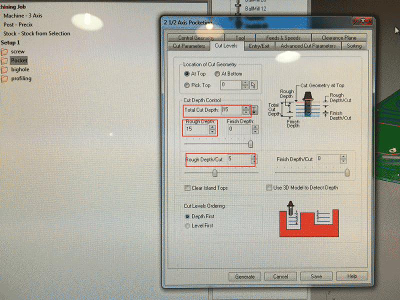 In the cut level, choose total cut depth as 15, rough depth as 15 and rough depth/cut as 5.