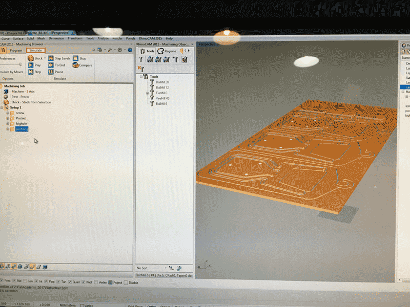 For the chair, there are a few points that i have to improve. First of all, I have to pay attention to the dimension. It is because originally i planned the hole should be in the position with the extruded side, so that it can be locked. Also, The gap between the two lines are too big that at the end i will have to eliminate one cutting line and reproduce the Gcode. Moreover, I still have not make the joints between the planes for folding. I will have to figure out later.