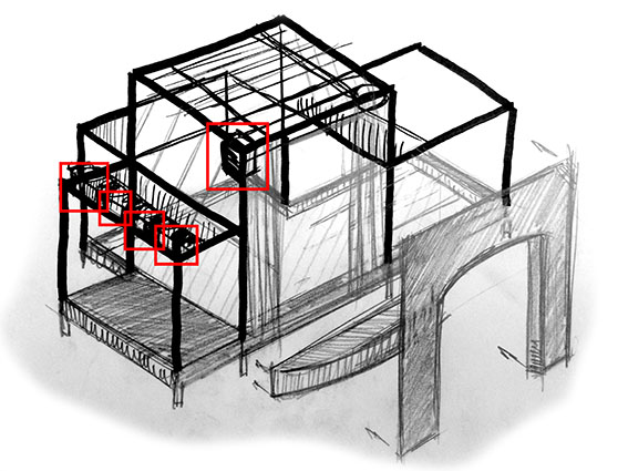Here you can see an isometric aproach to the general concept. I added some red squares to remark the motor-based movements. The top one would be a translation motor to open and close the main curtain.