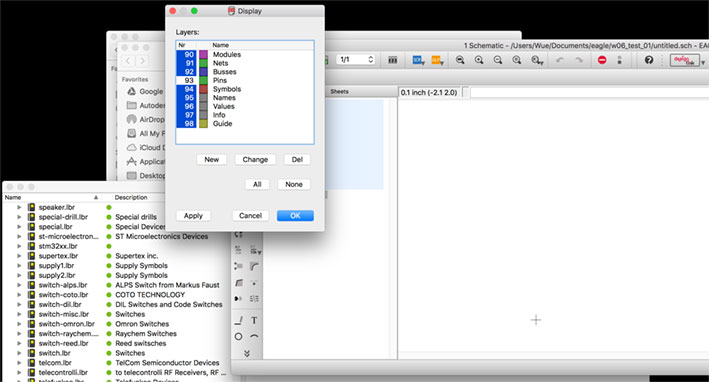 A I started with Eagle, I dowloaded the the FAB library directly to my computer and I installed it on the library folder of the software.I also started to wander a bit around the different windows of the program. Layers window on the image, and libraries on the left bottom.