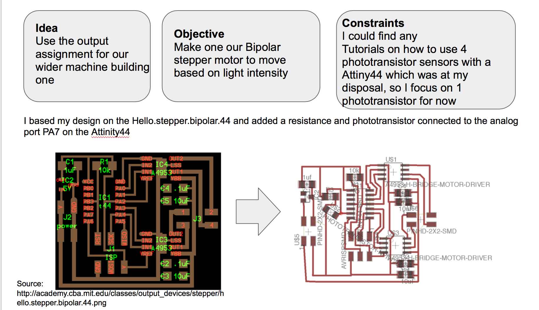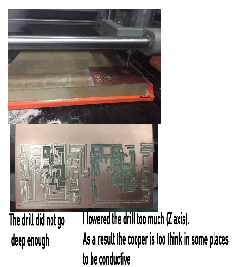 Another challenging electronic assignment for me, as I had to redo it in September, as I could not figure out the connection problems with my bridge board. In all honesty I prefer to understand how a circuit rather than spending an excessive amount of time checking electrical connections, milling board after board, soldering, etc.... However at the end, i managed to make the board work. Here is desribed the work done during the first week, and the work conducted in September. |