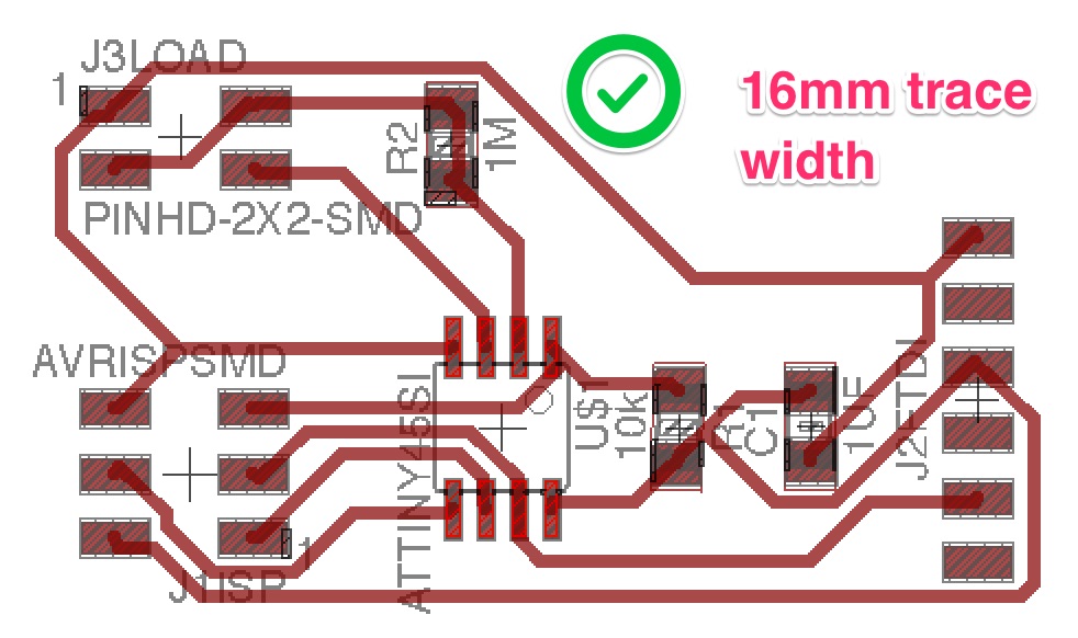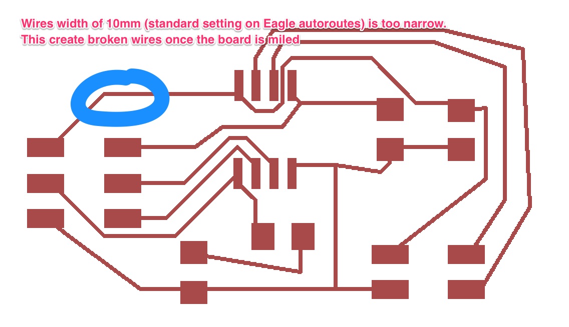 I was very quick in creating the schematic in Eagle for starting widh the node. I then run the autorouter. Unfortunately, the traces were too thin (see picture below)