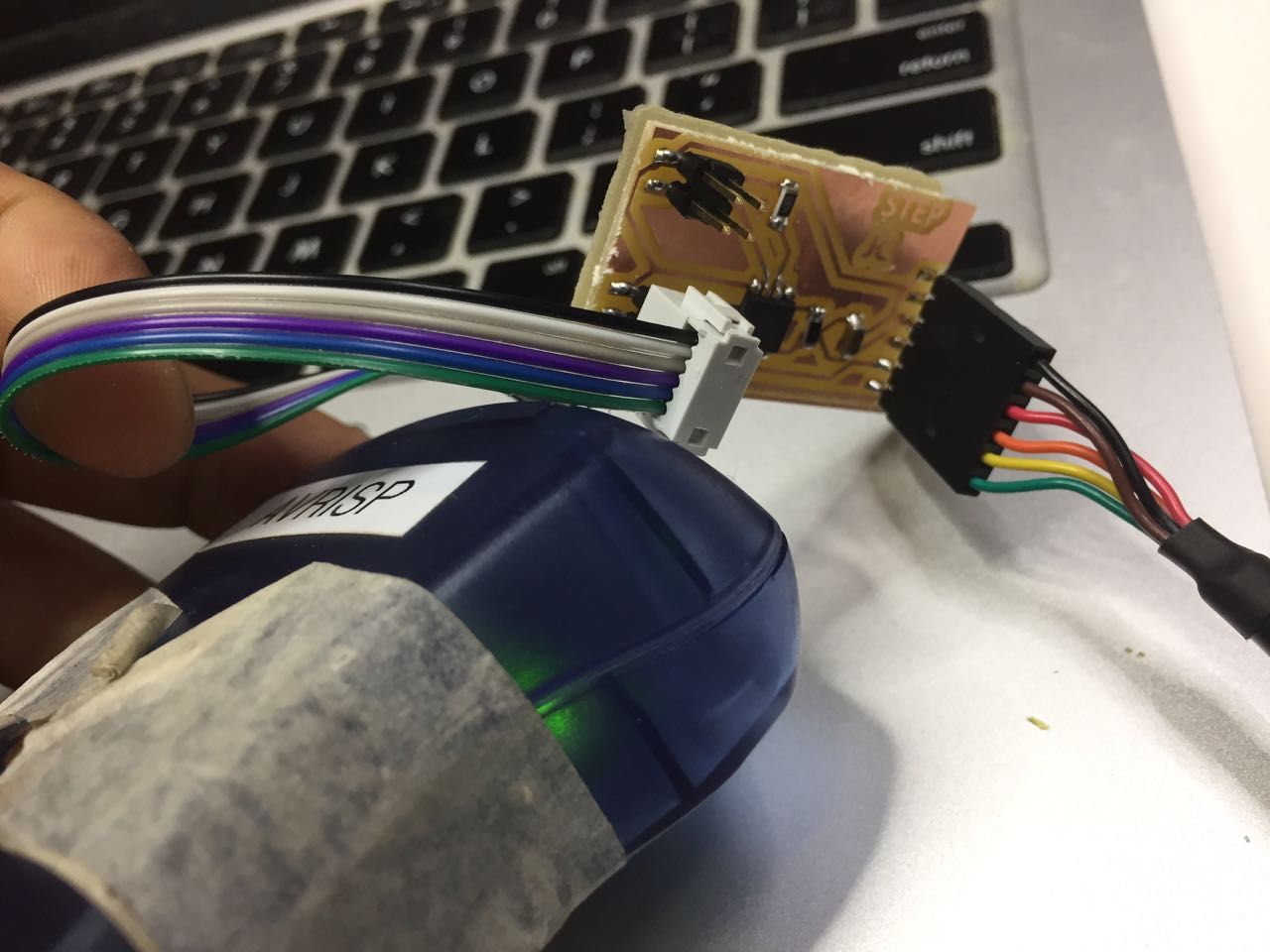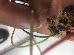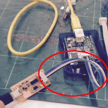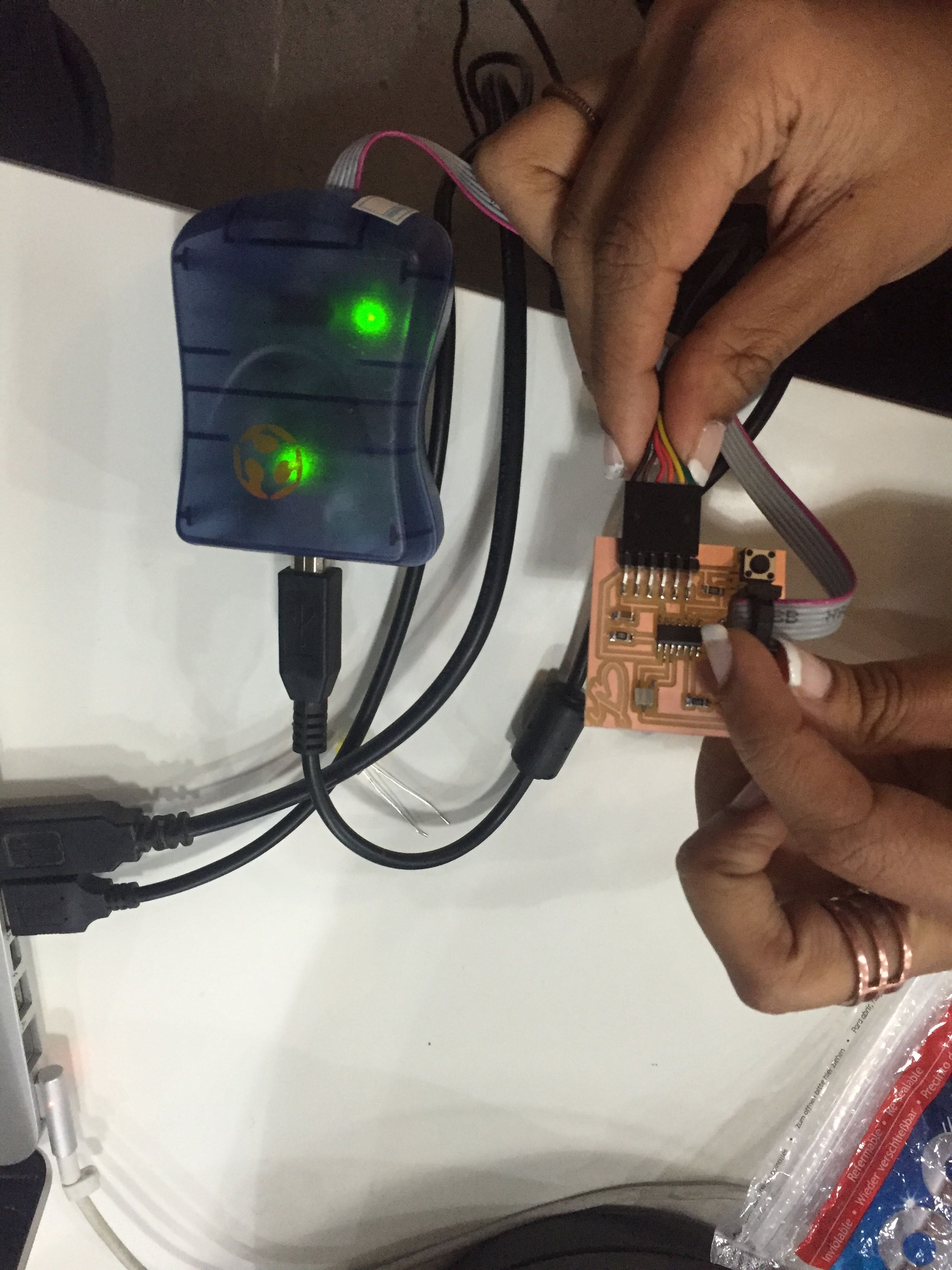 Plug your FabISP (programer board) to the computer, then plug your input board to the programer.