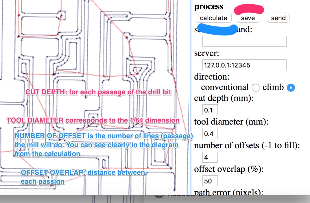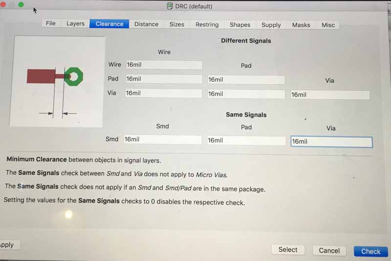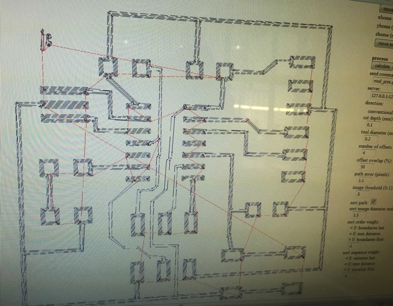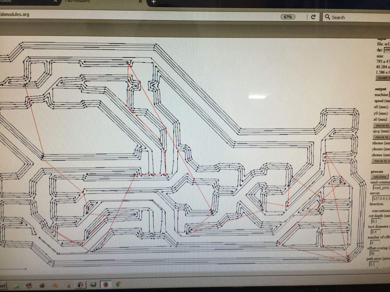 Below you can see the clearance issue in FabModule not identified in Eagle with a trace of 4 offsets. I then had to change in Eagle the clearance of those lines.