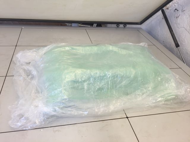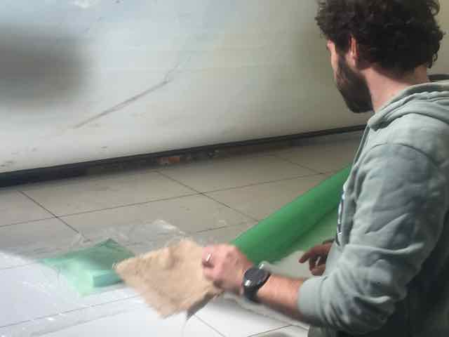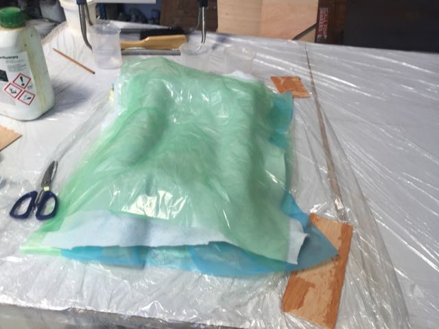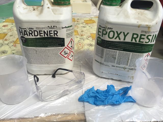 Starting with safety (chemical protection gloves, and glasses), I mixed 2 volumes of expoxy with one volume of hardener. Bear in mind you have about 10-15 mins to cover your fabrics with the mix before it becomes hard.
