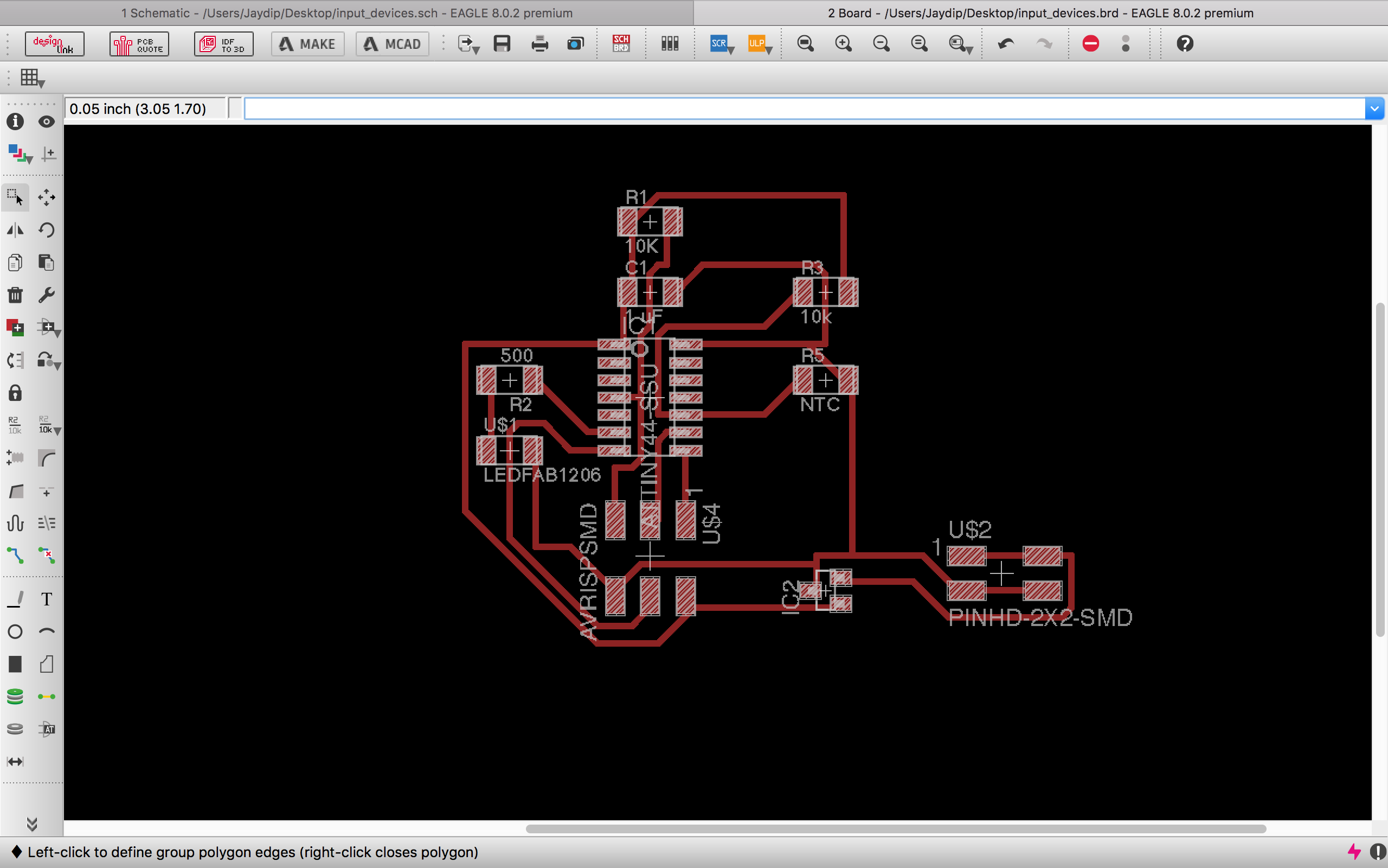 As per the comments from my global evaluator, it is necessary to make separate board for INPUT devices Week. So, I decided to make a board having NTC thermistor as input. When thermistor senses temp above 50degree, LED will glow otherwise LED will be off.