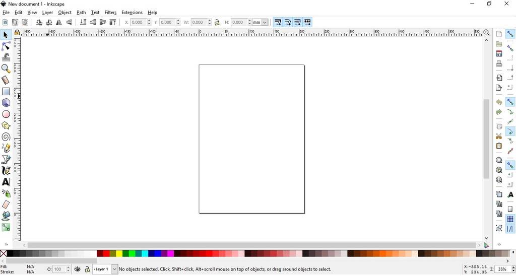 After opening Inkscape for the first time, we get a blank page & bunch of different toolbars such as Toolbar, the Tools Control Bar, and the Colour Palette as shown below: