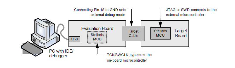 The Stellaris LM3S6965 Evaluation Kit can operate as an In-Circuit Debugger Interface (ICDI). ICDI acts as a USB to the JTAG/SWD adaptor, allowing debugging of any external target boar that uses a Stellaris microcontroller.