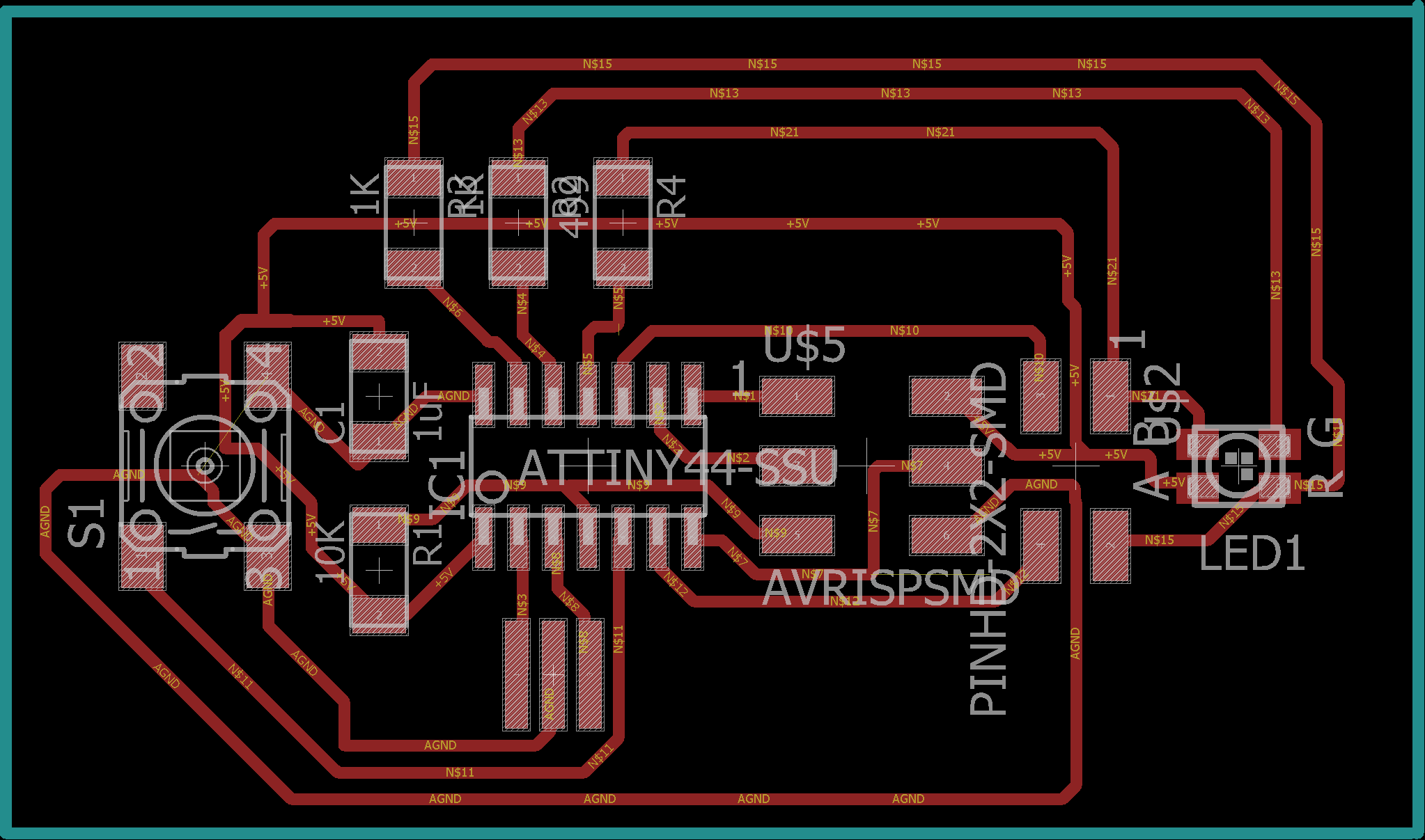 After understanding the ATtiny 44 then I prepared the schematic of the circuit using Eagle. The below images depict the schematic & the board.