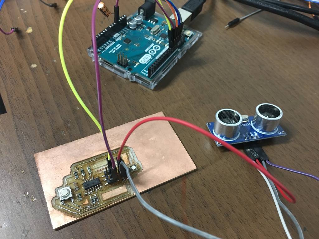 The next step is to connect the board with all the elements to check the working of the board with the program written into the micro-controller.The connections of the Arduino board with my board is shown in the image. I burnt the codes into the micro-controller to check that the LED is working. Finally I burnt the program in which, when an object is at a distance less than 25mm from the sensor the LED will glow.