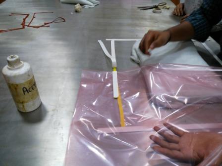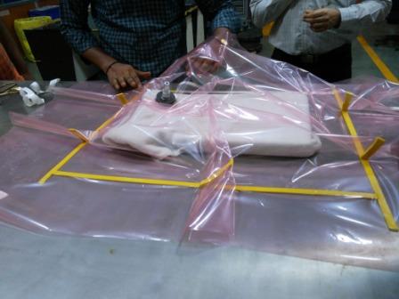 Step 9: Hold all the objects together & place them in the vaccum bag & apply vaccum for the composite clothes to bind together. Keep the vaccum ON for 60 to 80 seconds & then remove. Let the mold with the layers of composite rest inside the vaccum bag for 10 minutes.