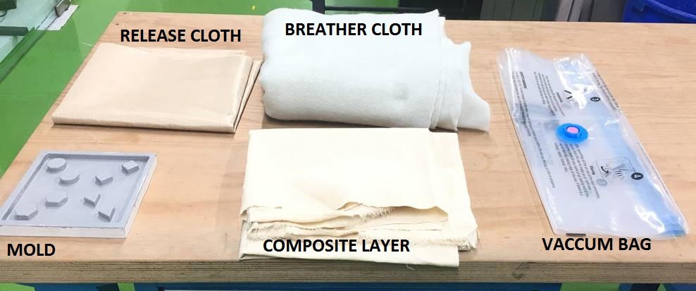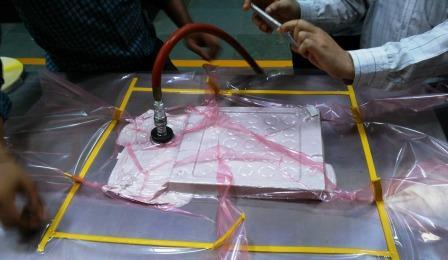 The simplest form of making composites is Vaccum Bag molding. Our colleague explained the process of making a composite using vaccum bag molding process. As an improvement on the hand lay-up and spray-up processes, it is possible to insert laid-up moulds into special bags, which are then evacuated and/or placed in an autoclave for cure under controlled heat and pressure. This vacuum consolidation method produces high-quality mouldings, with complete exclusion of air bubbles and improvement to the inner surface of the moulding, which is not in contact with the mould.