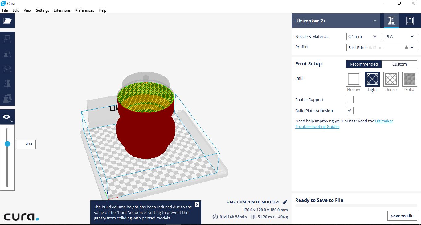 I then converted this model in to .stl file for 3D printing. The below image shows the .stl file being imported into CURA 2.0 before 3D printing.