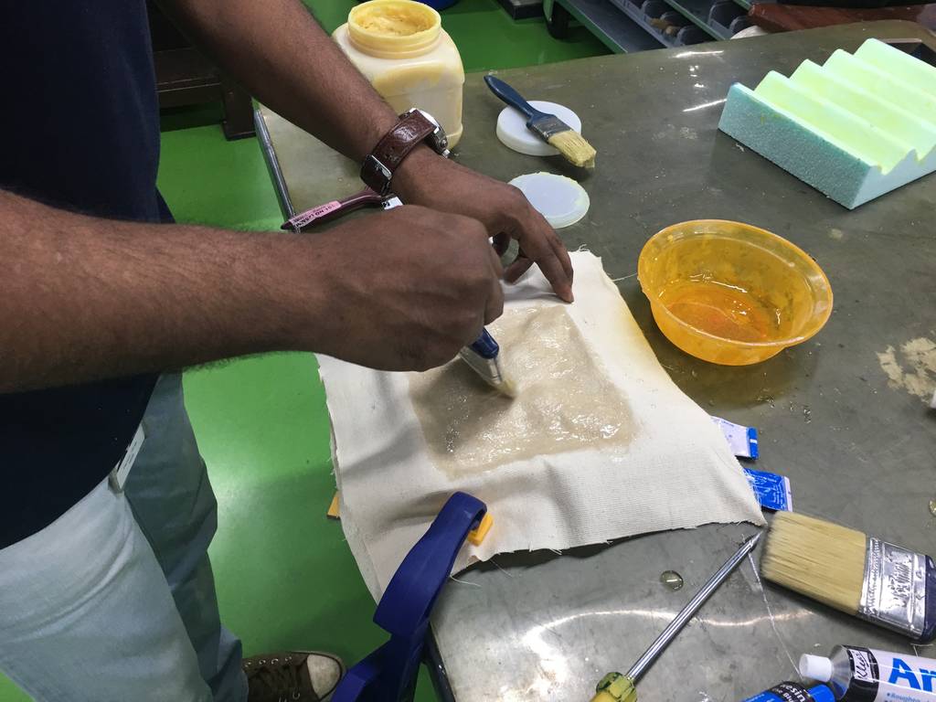 Step 6: Mix the equal portions of the Araldite in a bowl. Then place one layer of composite cloth on the grease applied mold & apply the mixed araldite on the cloth as shown.