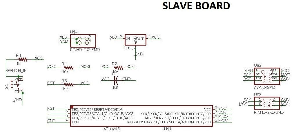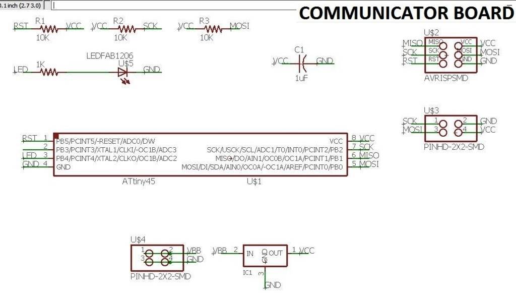 After understanding the ATtiny 45 then I prepared the schematic of the circuits of both the Communicator board & the slave board using Eagle. The below images depict the schematic of both the boards.