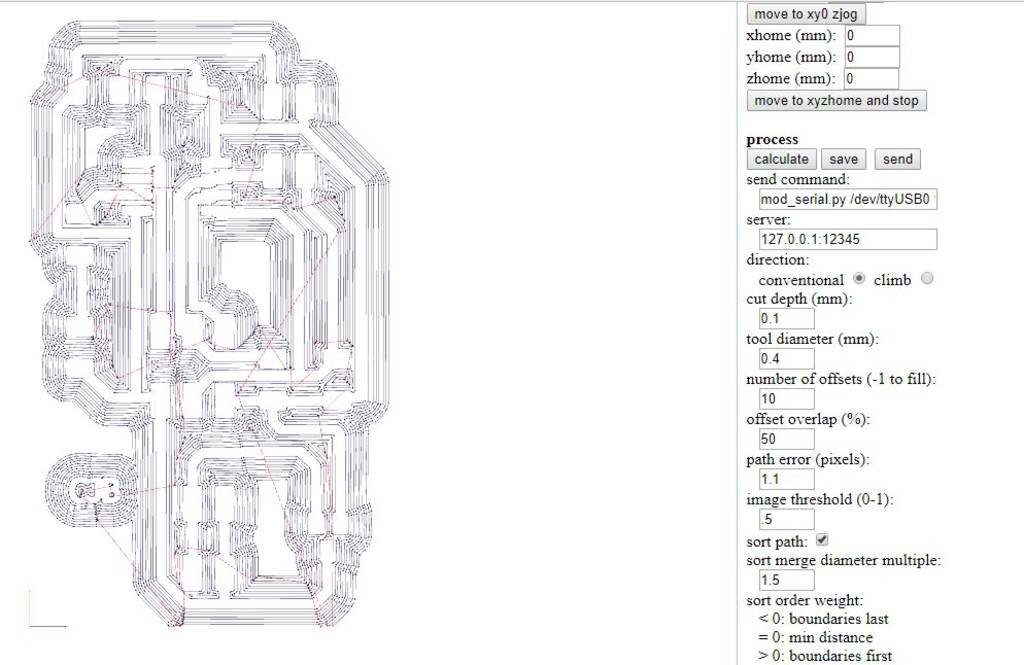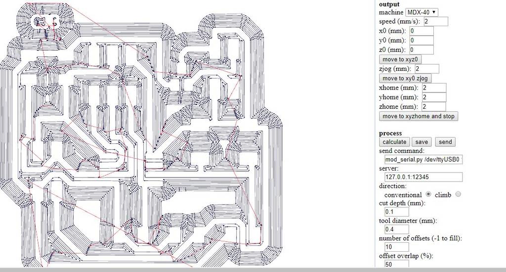 Import the .png files of the traces & the outline of both the boards into Fab Modules to generate the ".rml" code which will be used for milling of the boards on the MDX-40 machine. The below images show the rml code generated using Fab Modules.