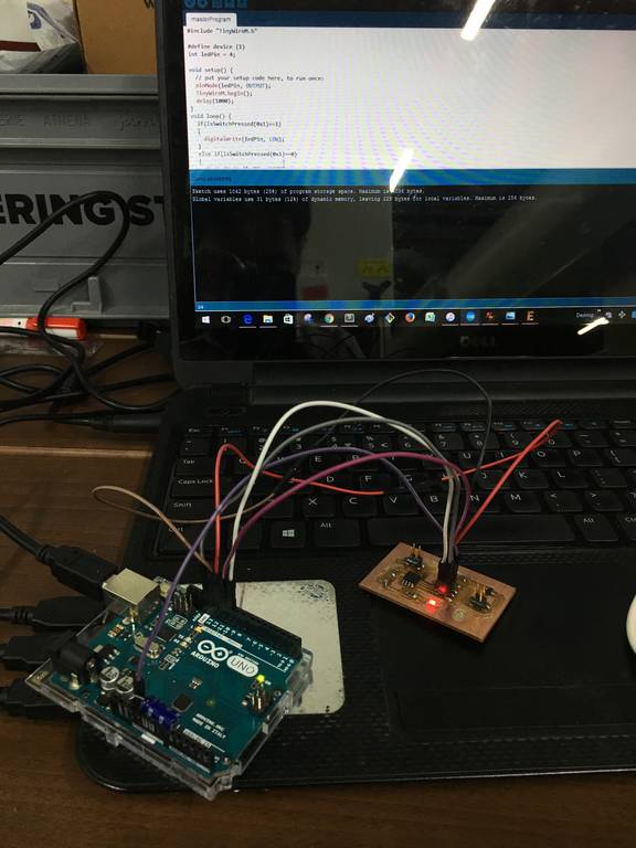 The image shows the LED glowing once the code is burnt to the micro-controller of the board.