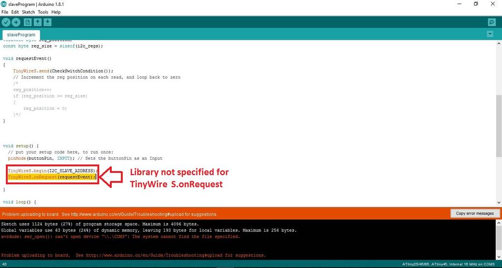 Now the problem of error was gone, but still the boards were not getting communicated. At this stage I found that the library for "TinywireS.h" was of older version & required updated versions of library. Then I followed the link as mentioned here to study the answers for various queries related to Arduino Library. Arduino Playground