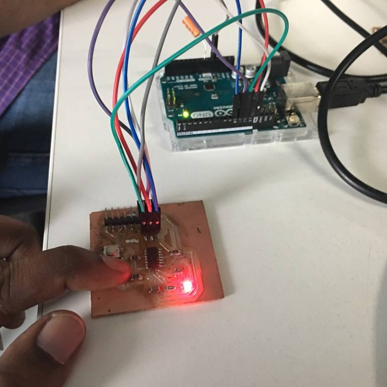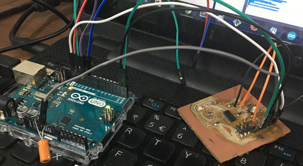 Since I used AtTiny 44 for my echo hello board, I needed to add software serial to get data via serial communication. I needed to send data from my GUI to make LED on my board blink. Hence, to begin with I modified the basic blink code of Arduino and added Software serial to the code to begin serial communication between the RX-TX pins. The image below shows the MISO, MOSI, SCK connections from my board to the Arduino via which I uploaded the code onto my board.