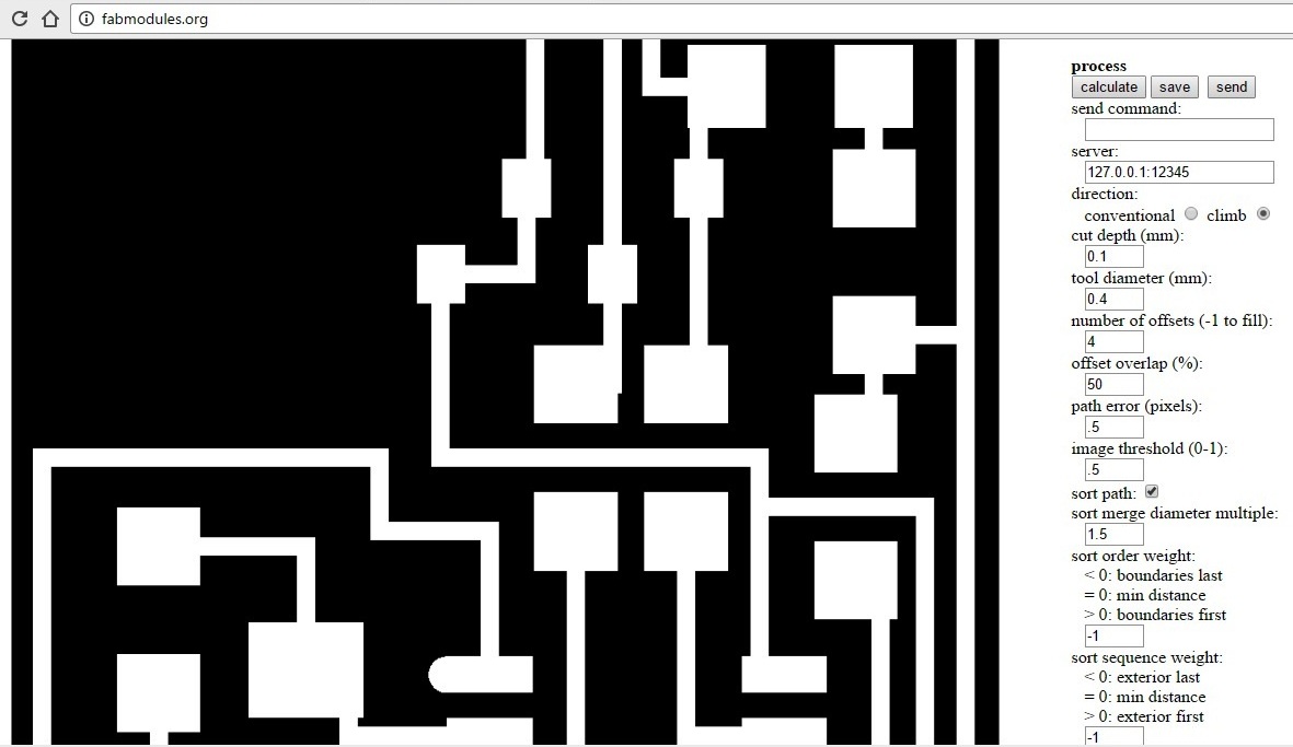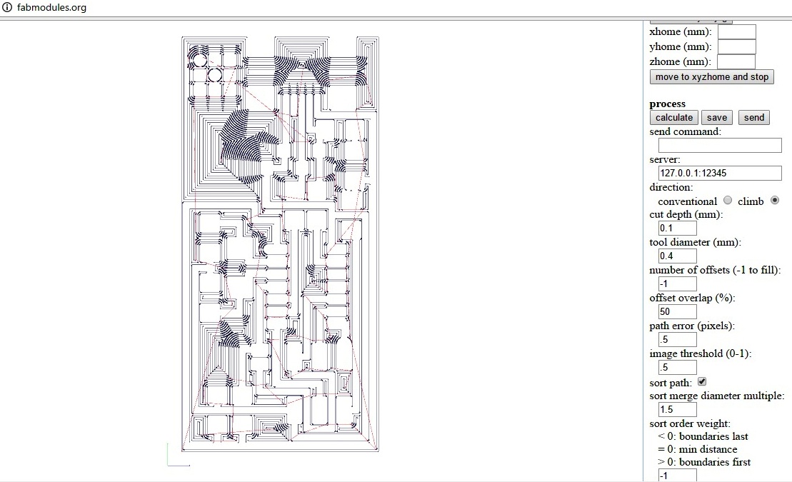 Once everything is setup, we need to click on "Make.rml" and the print order can be send to the machine by clicking "Send". The machine will right away start milling the board.