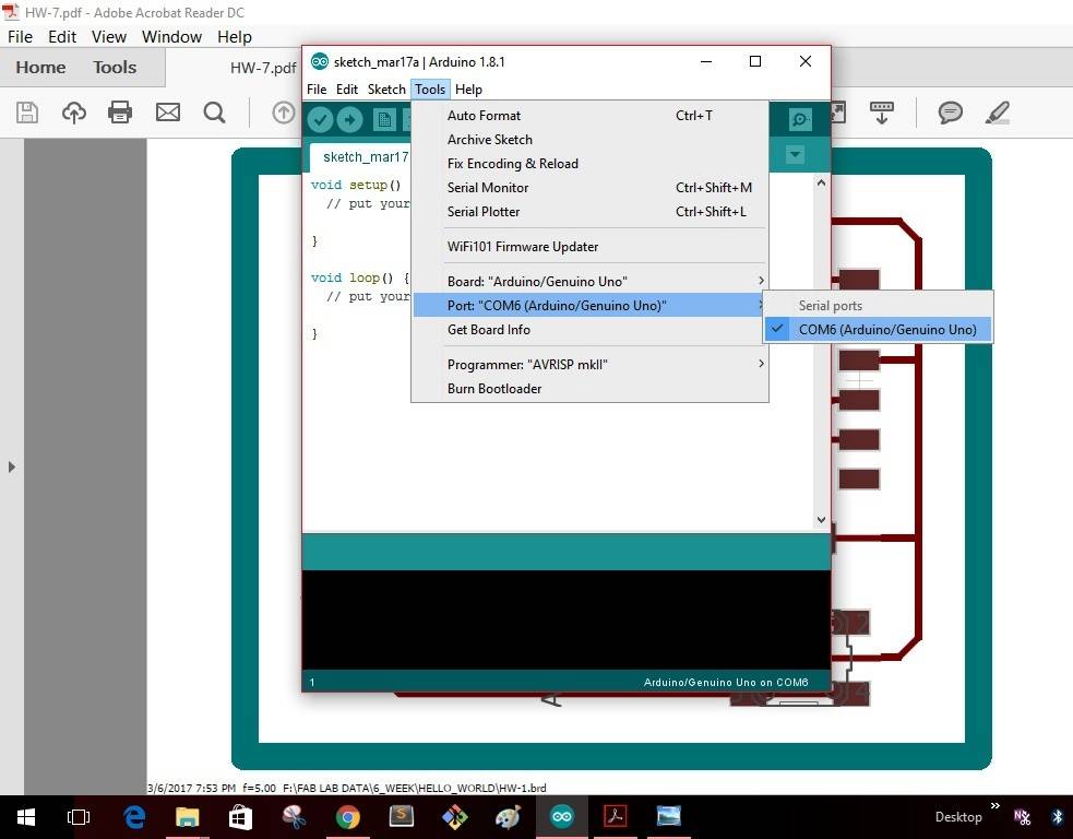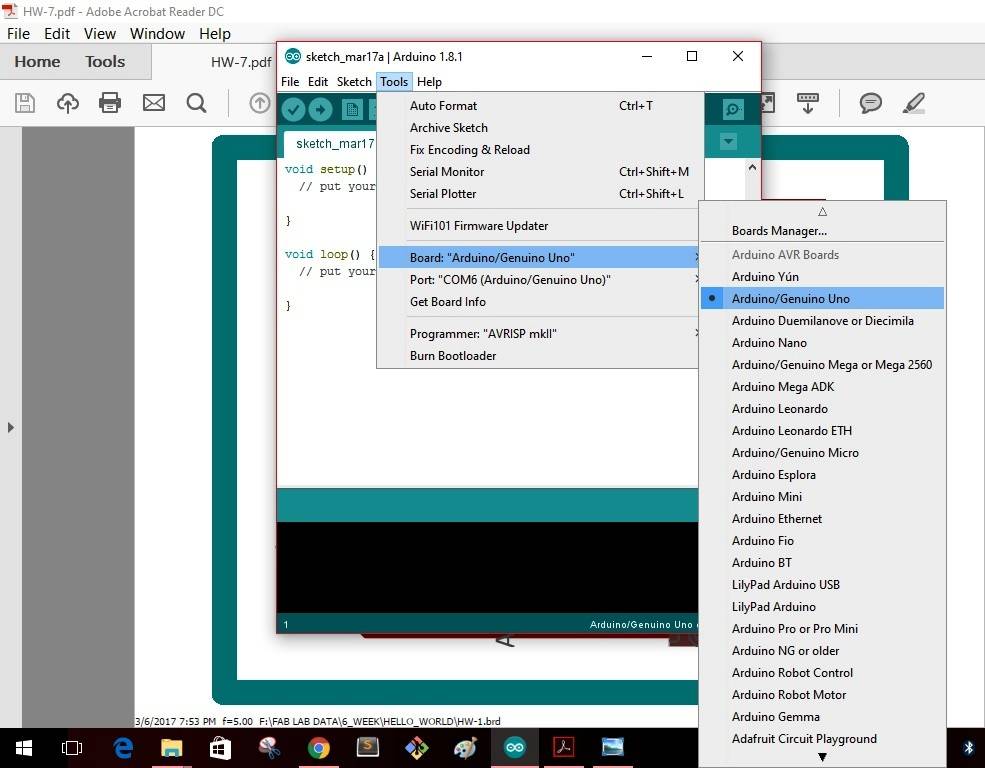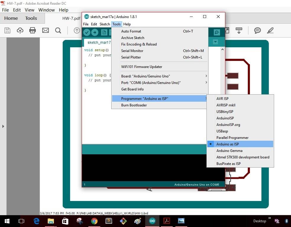 First I connected the Arduino board to my computer. I will make the Arduino board as a programmer to program my Hello World Board. Doing the following steps as seen in the below pics: