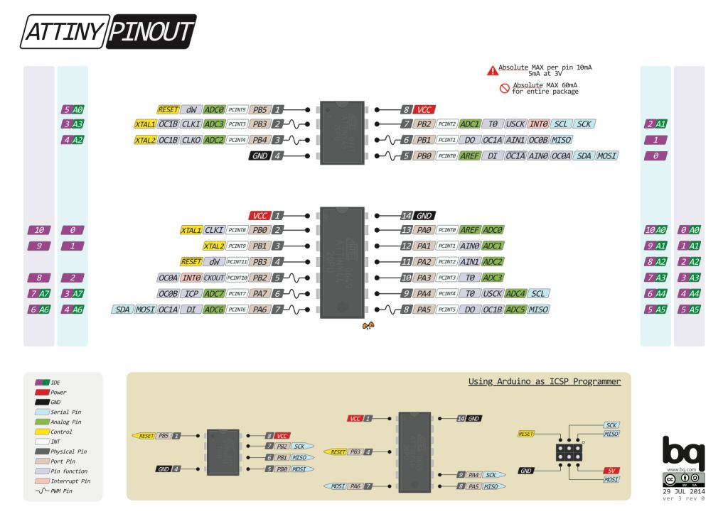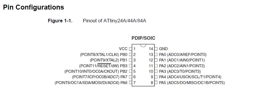 The Pin Configuration and Pin Descriptions in Section 1 are important - PighiXXX has created very nice color-coded pin-out diagrams for many processors including the ATtiny family, including pin mapping for the Arduino IDE:
