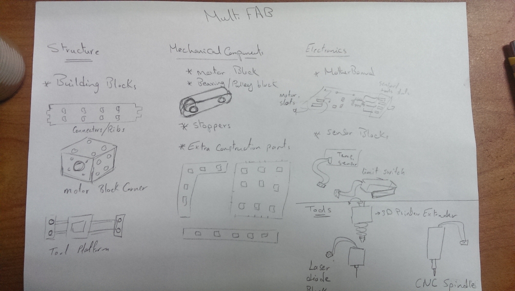 I think that everyone, especially you, have used a robbotic kit or read about one. And it's popular because it enables everyone to start building robots without any background, and it keeps teaching you many concepts till you become an expert and you start making your own robots. In my project the concept is the same, but I'm working with machines instead of robots. Machine Designing can be very tricky, and I have met many developers who failed to complete building their own machine, either because they can't find the right materials, or due to lack in experience. My Project "MultiFAB" is a universal machine construction kit, which you can use to build your own machine. My scope for Fab Academy is to build a universal platform/mechanism that can be used to make 3D printers, Laser Cutters, and CNC milling machines. Here's my basic plan for the project.