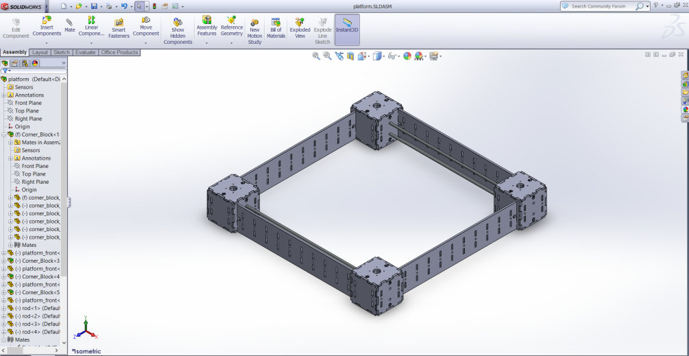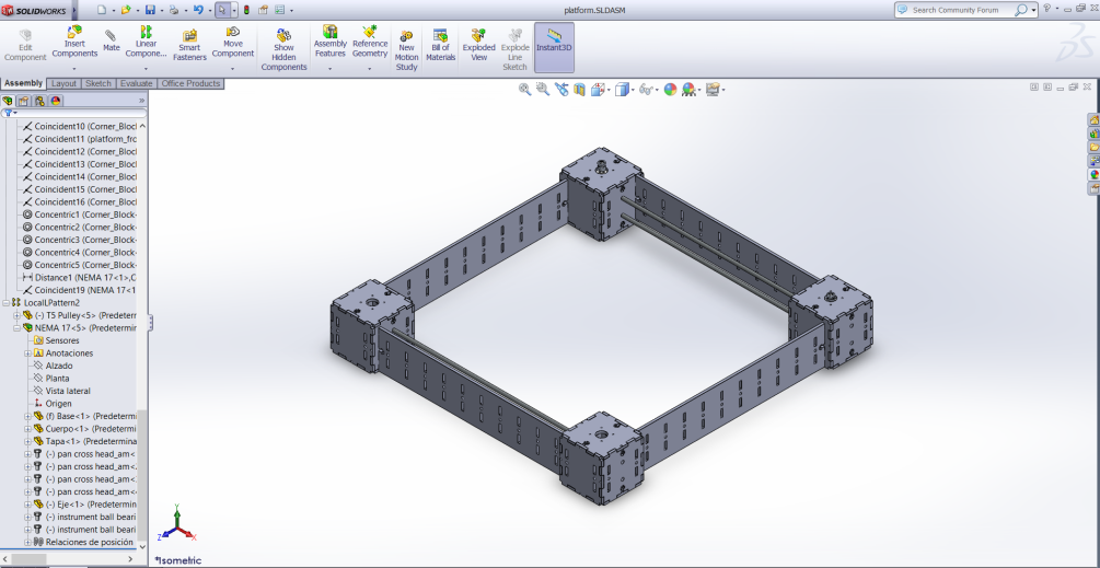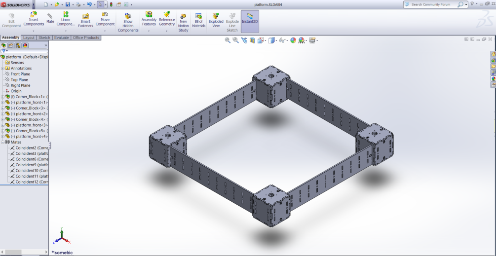 After that I have assembled the whole platform, and added some mates and relations to get this final 3D model.