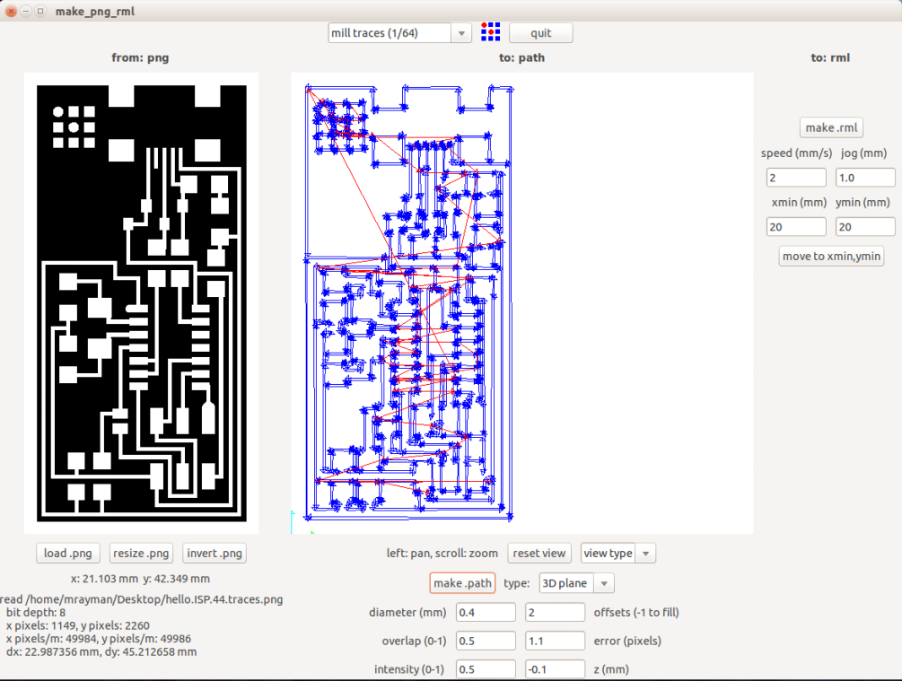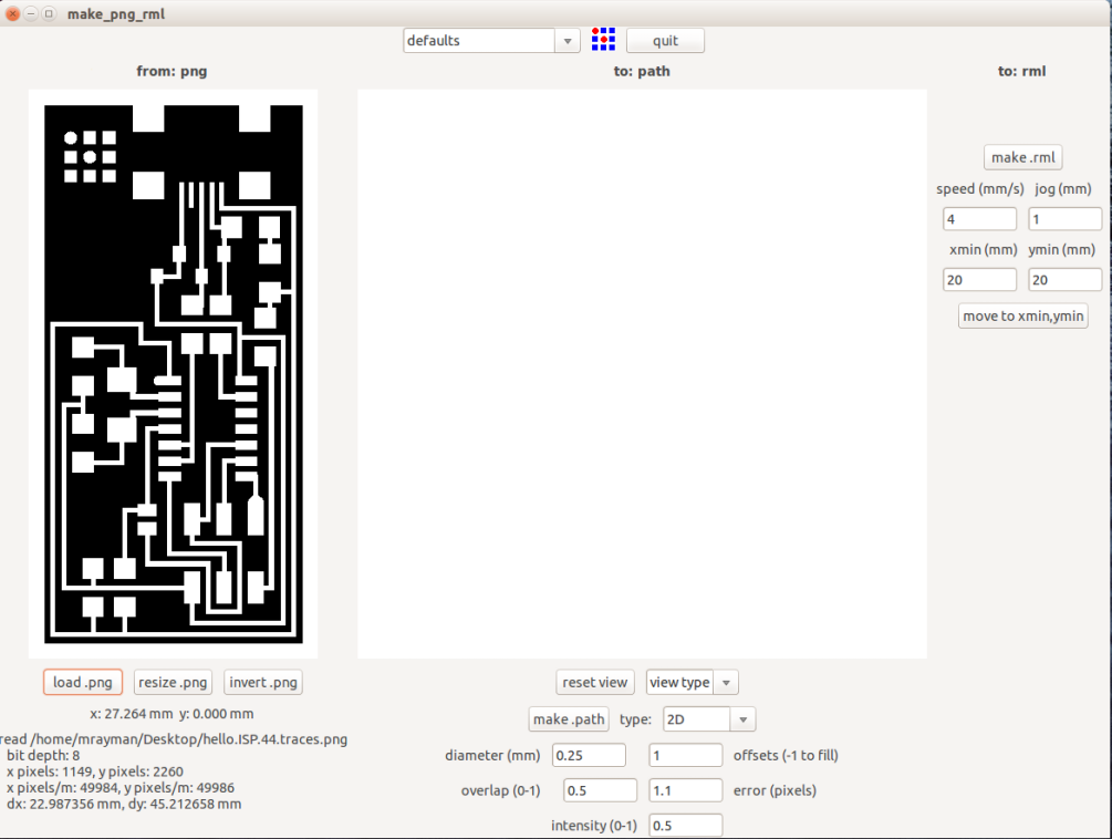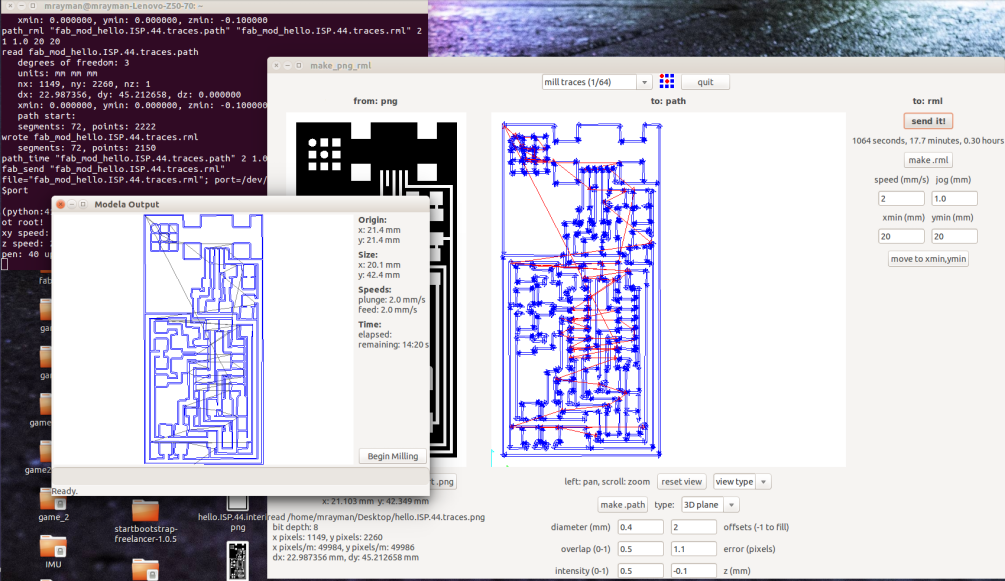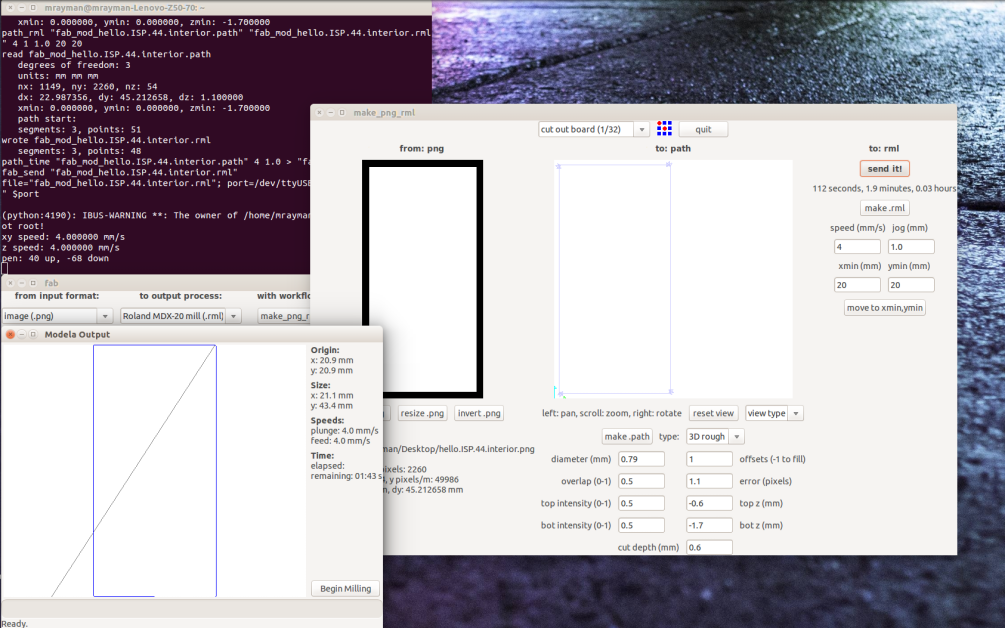 When you finish editing the parameters, click "make path". Check the preview for any problem, then move the machine to the start point, choose x,y coordinates then click "move". When you are ready, click "make .rml", then "send it!", a new window will open up then click start milling.