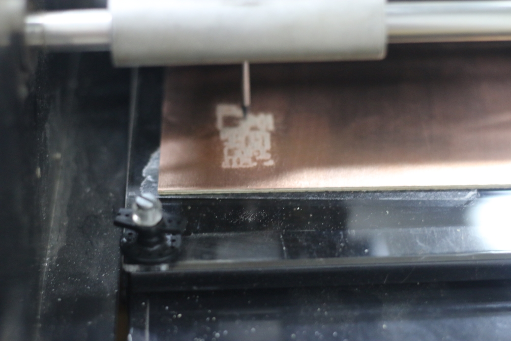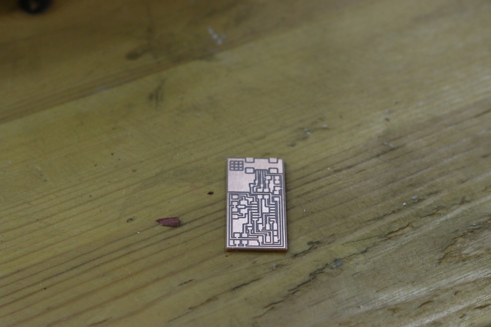 When your machine finish, press the view button, change the endmill to the 1/32", then re-zero the z-axis. Remember don't change the start x,y coordintes to perfectly locate the cutting image. Now load the outline image, and choose "cut out board" process, and repeat the same steps; "make path", "make .rml", "send it!", and finally "start milling". The cutting process is a lot faster, it took around a minute. And now I have a clean perfectly millied circuit.