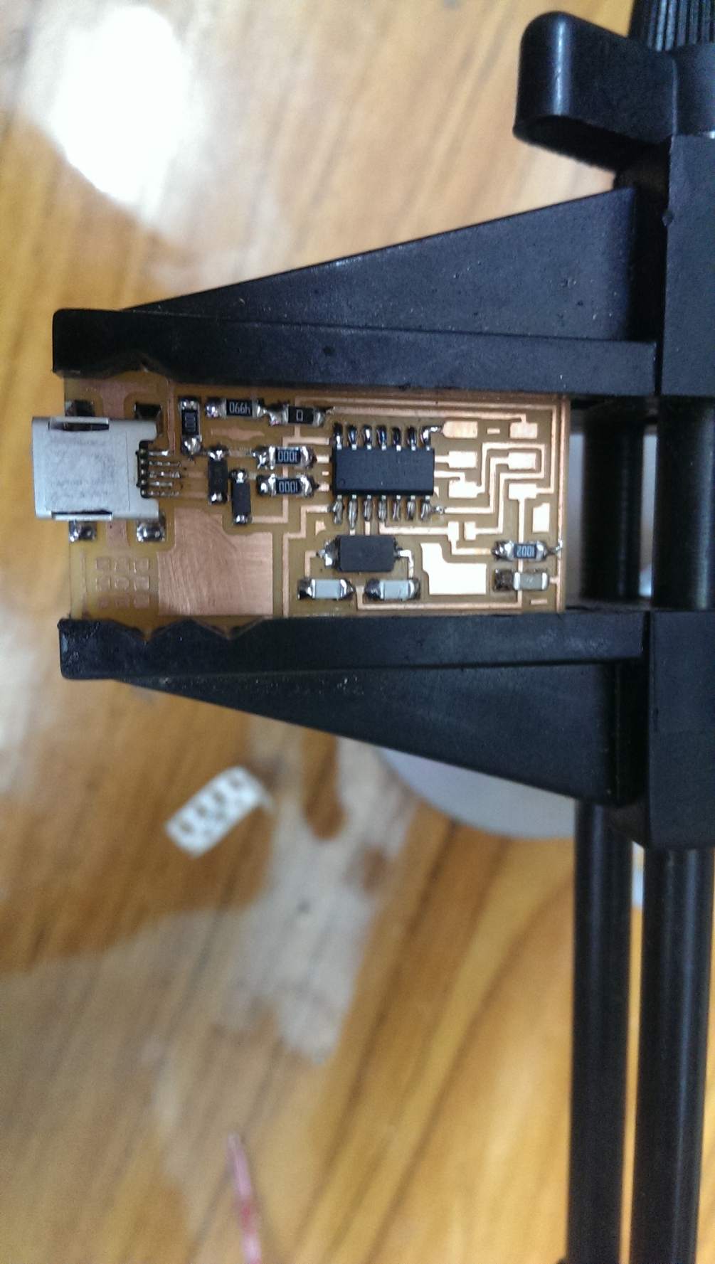 Before soldering, you should get your bench ready. Keep the soldering station powered and beside you, get the components ready and you might need to clean your bench not to lose them. Then start soldeing from inside out, and start with the smaller components. These are some tips that might help you: 1. Use a circuit holder. 2. When soldeing large components (i.e. the Attiny 44) start by melting some solder on one of the pads, then use the iron to solder this pin of the MCU, usually start with pin 1 to get the orientation right. After that, start soldering each pin. 3. Don't apply too much heat. Keeping the soldering iron in contact with the copper for too long might rip copper off the board becuase of the excessive heat. 4. Remember to check the polarity of diodes before soldering them. 5. The USB is the most tricky part.