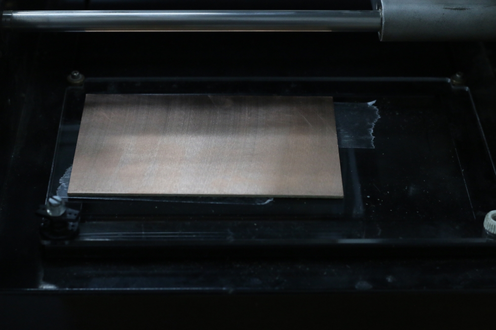 Then adding some double-face tape to hold the copper board in place. Don't use too much tape tp be able to take the board off when you finish. Apply some pressure to make sure that the whole board is flat.