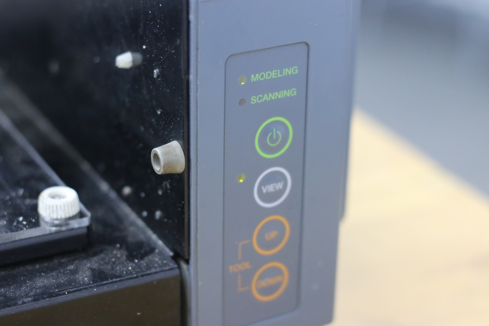 Well I remember my first time using this machine, it really took so much time to get used to it, we call at Fab Lab Egypt "Mozela" which an arabic word for "humiliating", because it was too hard to learn how to smoothly run everything. Anyway, now we will install the endmill, we will use 1/64" to cut traces and 1/32" to cut out the board. Before anything, make sure that you are in the View mode, otherwise click on the View button, the machine will move home and stop. Then slide the endmill gently and leave a resonable part inside the machine -we will zero the z-axis later- then gently tighten only one of the screw, don't tighten both because the two screws will start pushing each other. Then press the View button again, the machine will move to the last rememberd location. Now it's time to set the z-axis, there're two ways to do this. The first way is to use the arrow buttons in the front chasis to lower the spindle tell the endmill just touch the copper board, remember just touch. The other way, which I prefer, is to un-tighten the screw then gently push the endmill down till it touch the copper board -don't let it fall-, then re-tighten the screw.