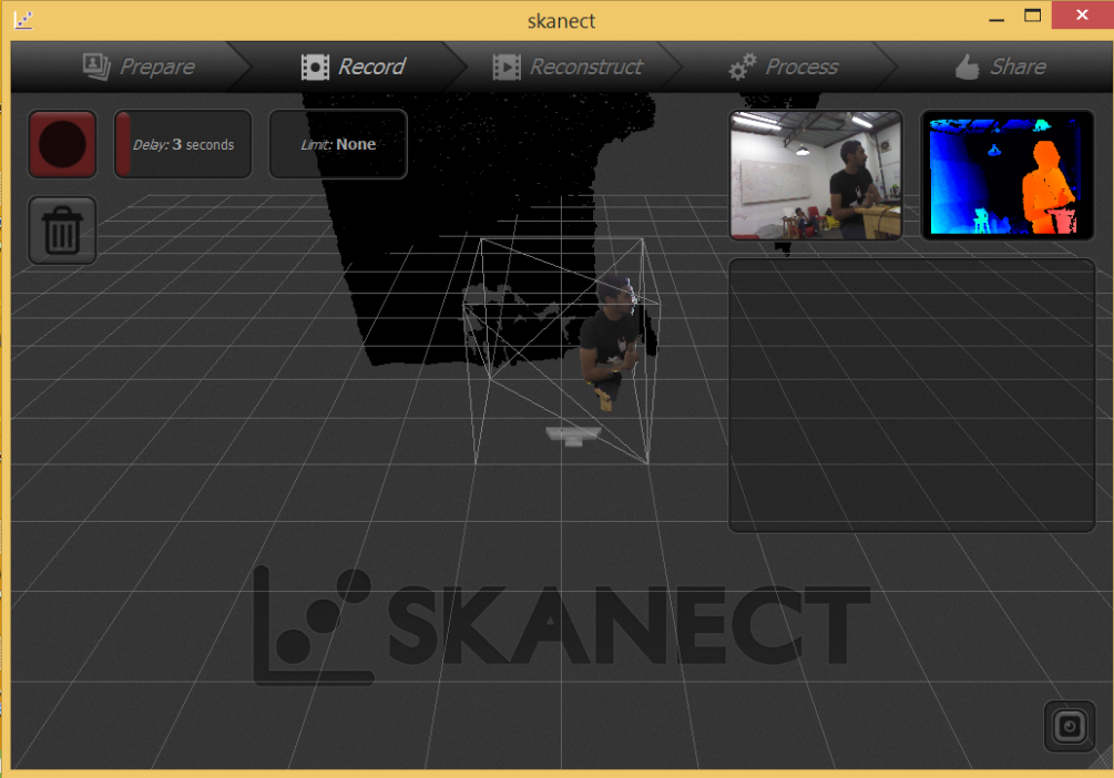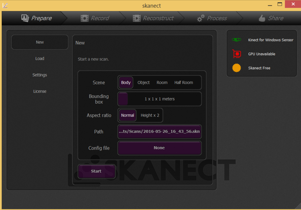 Once you have installed everything, open the skanect software and connect the kinect. You'll get the opening interface to set-up the the scanning job.