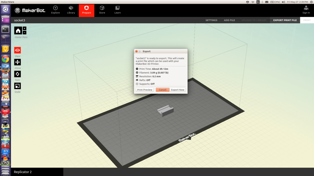 After that, click on print preview to check that your design is sliced correctly. And to know how much time and material the part is gonna take.