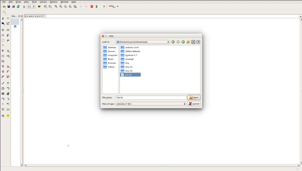 This week we are using Eagle software to design our circuit, you can download it here. Then after installing your software, you will have to download the fab library that contains all the components we will use. You can find it here. Just search for "fab.lbr". When you download the file, you can move it to your sketchbook director, inside lbr folder. Or you can just click on "library" then "use" and browse for the library and click ok.