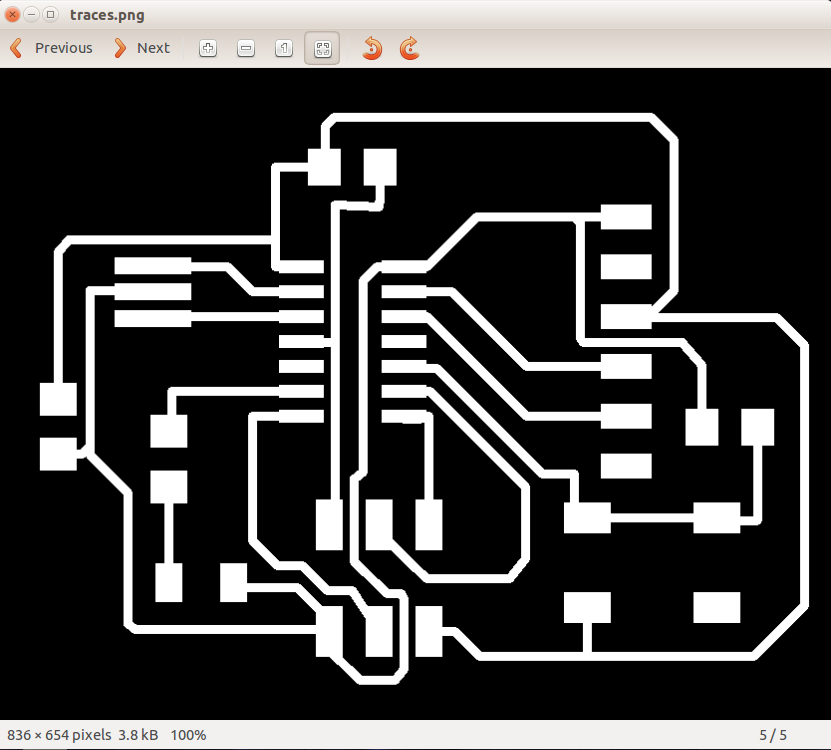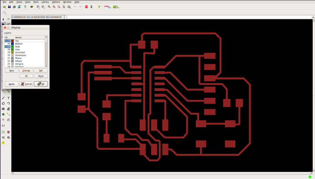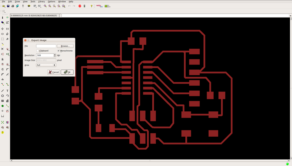 Now it's time to export our design. First we only need the layers of traces and pads, so from layers menu uncheck everything and only keep the top and pads layers. Then export to image, the resolution -in dpi- is important so the machine can read the dimensions right, I use 500 DPI for the MDX-20. Keep you image to monochrome to get a black-and-white image. Remember we need to files to manufactur the circuit, traces and boarder image. So after exporting the traces, re-open the layers menu and only keep the dimensions layer, and export another image.