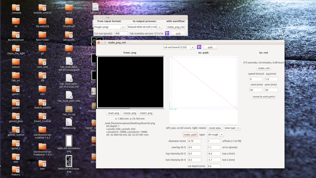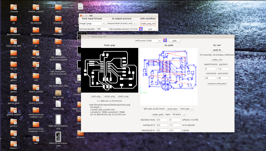 Load the images to the fab modules, adjust your parameters, zero z-axis, and then start milling.