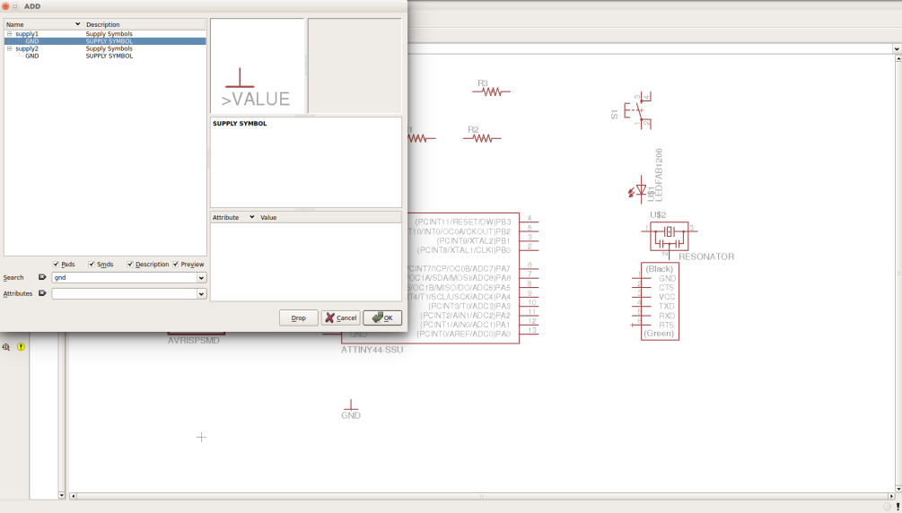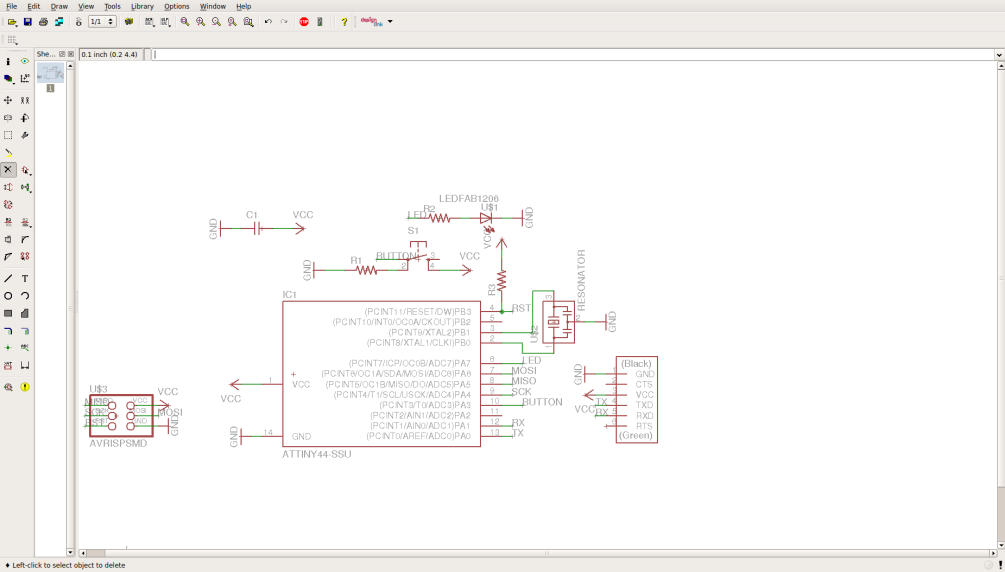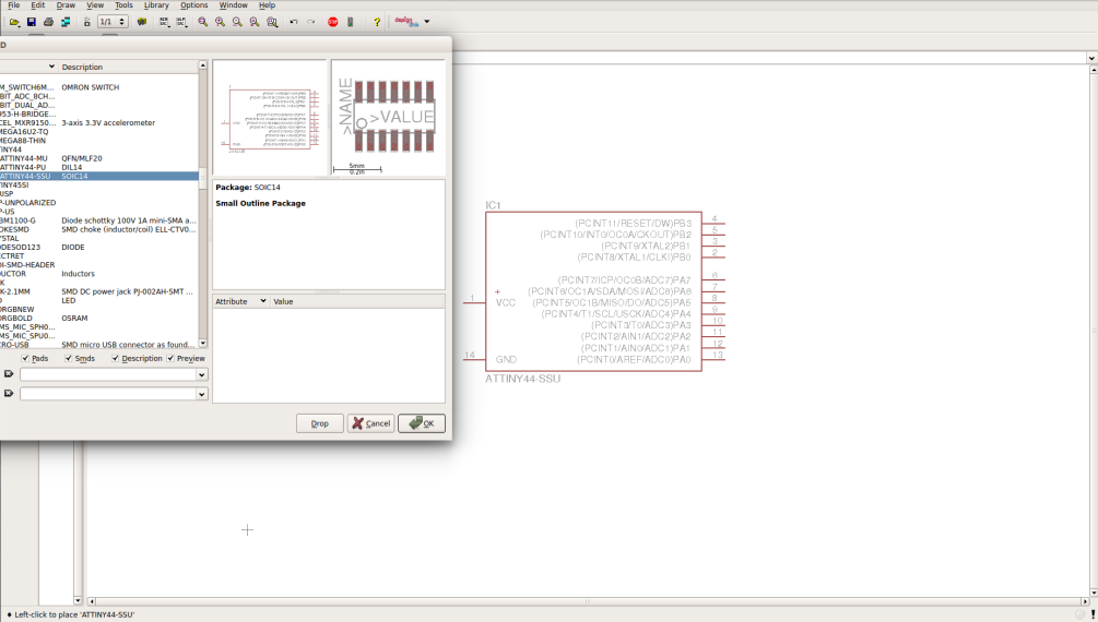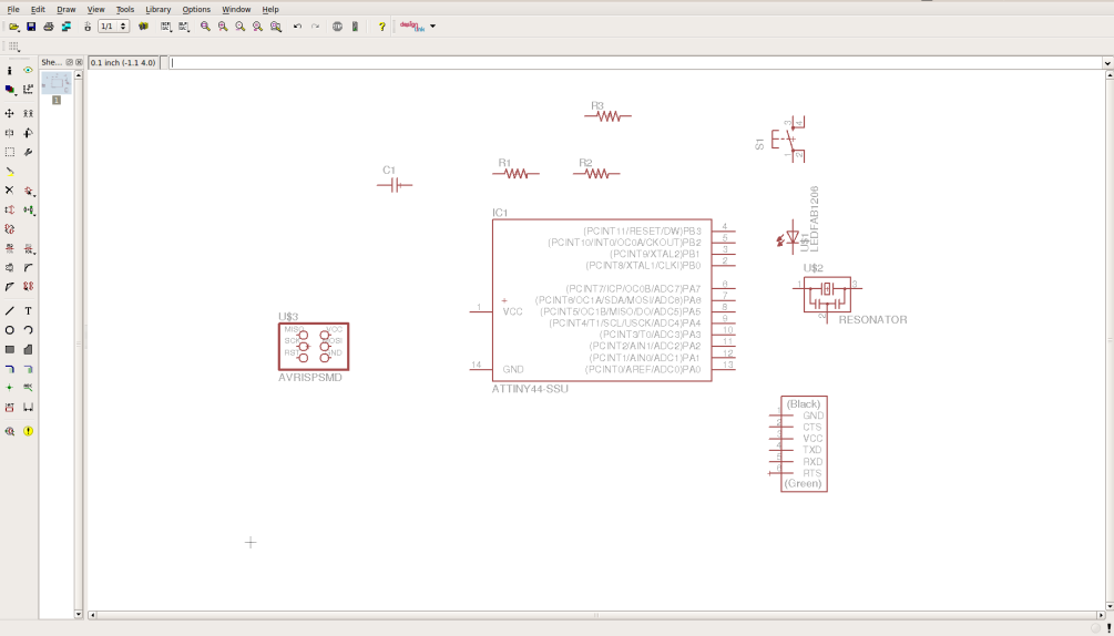 Start a new project, then create a new schematics (.sch) file. Now it's time to start adding your compoentes. You may use the hello world circuit as a start point, but you gonna need an extra led and button. Add all the componets needed and keep them apart. Remember to choose the right pacakage of compoenents, becuase each package has its own dimensions, and if you have picked the wrong one you will not be able to solder the components.